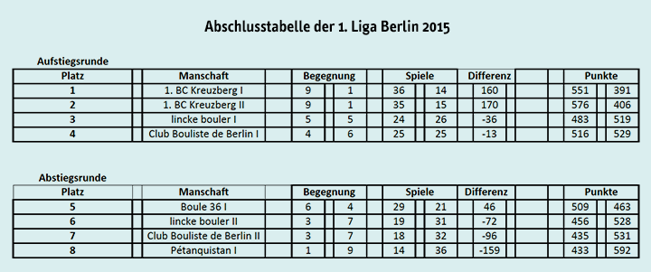 Gratulation auch den Aufsteigern! boule devant berlin II und au fer I steigen in die 1. Liga auf und die Saunafreunde Berlin sowie BCK III spielen in der nächsten Saison in der 2. Liga.