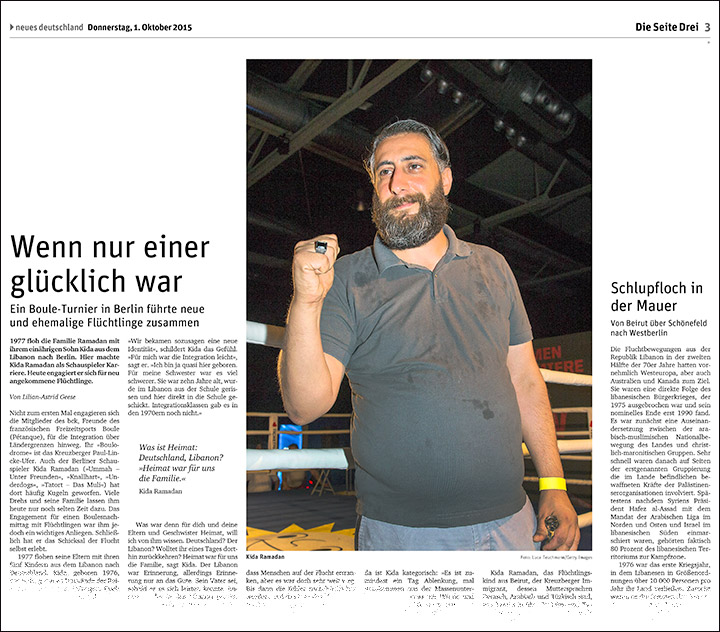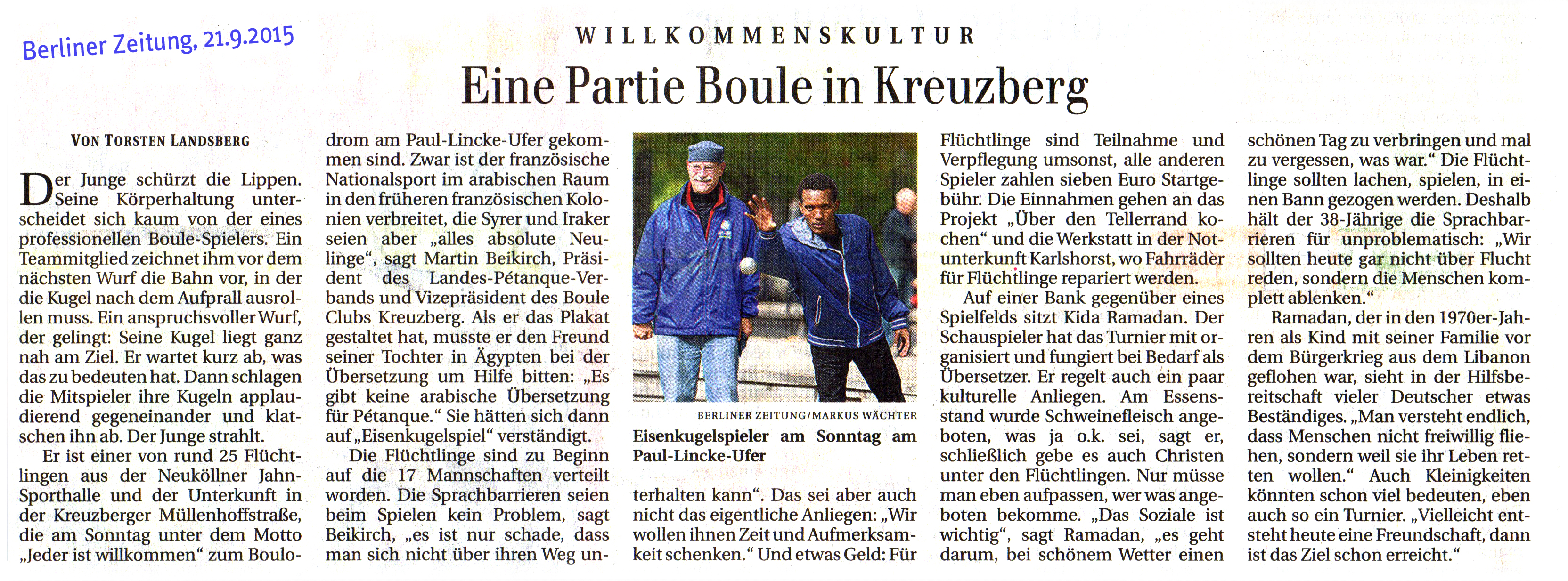 Nicht um Geld- oder Sachpreise war es am 20. September bei dem Turnier gegangen, zu dem die drei Kreuzberger Boules-Vereine – 1. BCK, Linckebouler und Bouledozer – und der Landes-Petanque-Verband Berlin an das Paul-Lincke-Ufer eingeladen hatten. Alle Startgelder und Überschüsse aus dem Getränkeverkauf, insgesamt 150 Euro* + 100 Euro Spende der Lincke-Bouler, gehen an Projekte der Flüchtlingshilfe (Fahradwerkstatt in der Notunterkunft Karlshorst). Vor allem aber sollte mit diesem Turnier noch etwas anderes gespendet werden: Zeit, Aufmerksamkeit und Ablenkung für einige der vielen, die ihre Flucht aus Kriegs- und Krisengebieten glücklich überstanden haben, deren neue „Heimat“ zunächst aber kaum mehr als eine unpersönliche und freudenarme Massenunterkunft ist.