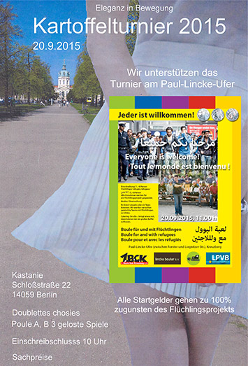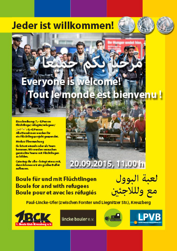 Klasse, die Boulefreunde aus Charlottenburg wollen ihren Teil dazu beitragen, dass am Sonntag, 20.9.2015, außer Spaß für alle Teilnehmer, noch etwas mehr für die Unterstützung der Flüchtlinge herauskommt. Mit allen Einnahmen aus beiden Turnieren wollen wir die Fahrradwerkstatt in der Notunterkunft Karlshorst – hier werden Fahrräder für die Flüchtlinge zusammengeschraubt und repariert – und das Projekt „Über den Tellerrand kochen e.V.“ unterstützen. Beim Turnier in Kreuzberg wollen wir Teams zusammenstellen aus Berliner Boulespielern und Flüchtlingen. Wer einfach dabei sein möchte, auch als Nichtspieler ist herzlich willkommen.