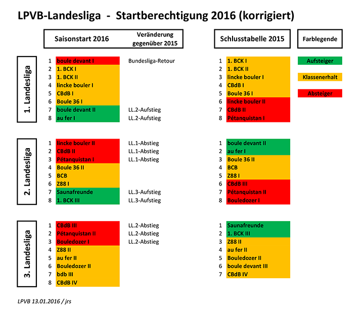 Von der 1. in die 2. Liga steigen Club Bouliste de Berlin II und Petanquistan I ab. Von der 2. in die 3. Liga geht es für Petanquistan II und Bouledozer I.